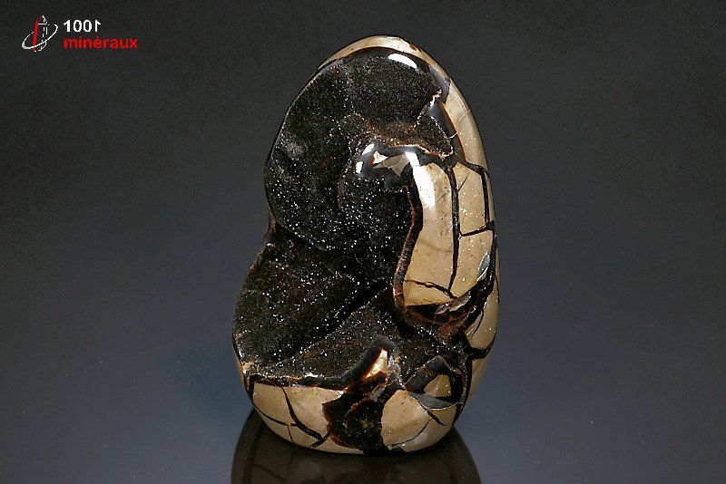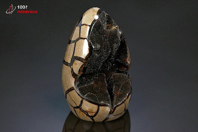 Magnifique spécimen d'un nodule de Septaria poli extérieurement montrant les veines de Calcite brun foncé à l'extérieur et une cristallisation noire de Calcite à l'intérieur.