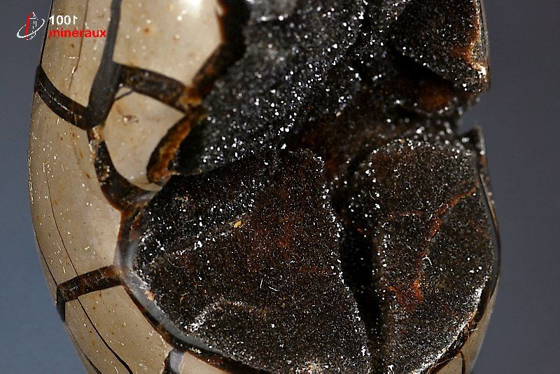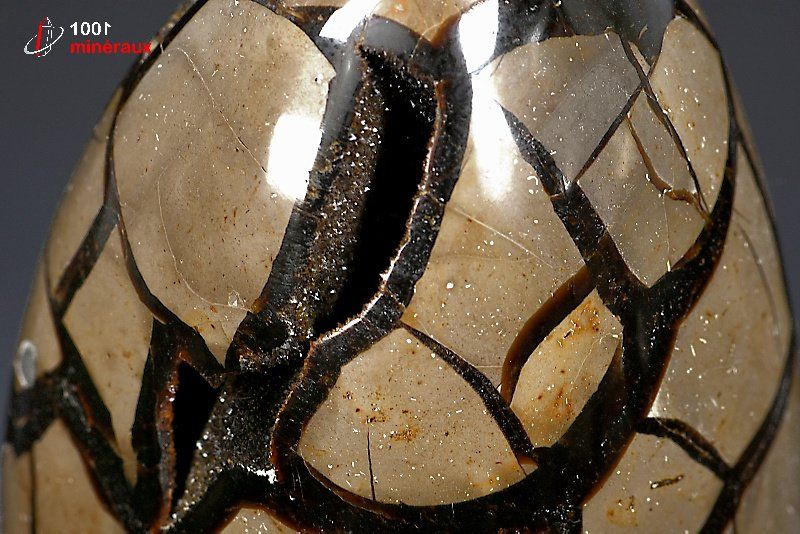 La SEPTARIA est le résultat du développement d' un réseau de fissures remplies de calcaire dans un nodule. Un nodule est un corps d'une forme plus ou moins sphérique et en général plus dur que les roches qui le contiennent. La présentation d'un nodule s'effectue en sciant celui-ci en 2 parties égales, et en polissant ensuite les surfaces internes afin d'en faire ressortir les fissures. La septaria est le plus souvent de couleur gris brun à noir, et brun foncé à blanc pour les fissures.