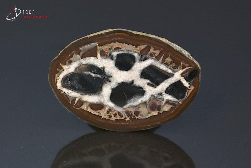 La SEPTARIA est le résultat du développement d' un réseau de fissures remplies de calcaire dans un nodule. Un nodule est un corps d'une forme plus ou moins sphérique et en général plus dur que les roches qui le contiennent. La présentation d'un nodule s'effectue en sciant celui-ci en 2 parties égales, et en polissant ensuite les surfaces internes afin d'en faire ressortir les fissures. La septaria est le plus souvent de couleur gris brun à noir, et brun foncé à blanc pour les fissures.