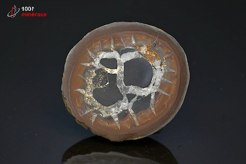 La SEPTARIA est le résultat du développement d' un réseau de fissures remplies de calcaire dans un nodule. Un nodule est un corps d'une forme plus ou moins sphérique et en général plus dur que les roches qui le contiennent. La présentation d'un nodule s'effectue en sciant celui-ci en 2 parties égales, et en polissant ensuite les surfaces internes afin d'en faire ressortir les fissures. La septaria est le plus souvent de couleur gris brun à noir, et brun foncé à blanc pour les fissures.