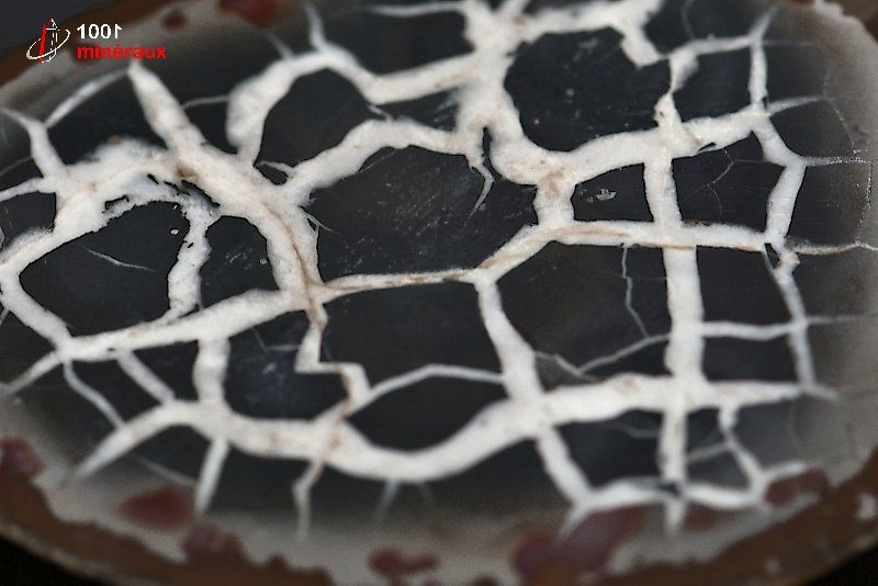 La SEPTARIA est le résultat du développement d' un réseau de fissures remplies de calcaire dans un nodule. Un nodule est un corps d'une forme plus ou moins sphérique et en général plus dur que les roches qui le contiennent. La présentation d'un nodule s'effectue en sciant celui-ci en 2 parties égales, et en polissant ensuite les surfaces internes afin d'en faire ressortir les fissures. La septaria est le plus souvent de couleur gris brun à noir, et brun foncé à blanc pour les fissures.