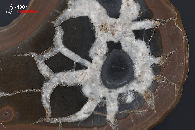 La SEPTARIA est le résultat du développement d' un réseau de fissures remplies de calcaire dans un nodule. Un nodule est un corps d'une forme plus ou moins sphérique et en général plus dur que les roches qui le contiennent. La présentation d'un nodule s'effectue en sciant celui-ci en 2 parties égales, et en polissant ensuite les surfaces internes afin d'en faire ressortir les fissures. La septaria est le plus souvent de couleur gris brun à noir, et brun foncé à blanc pour les fissures.