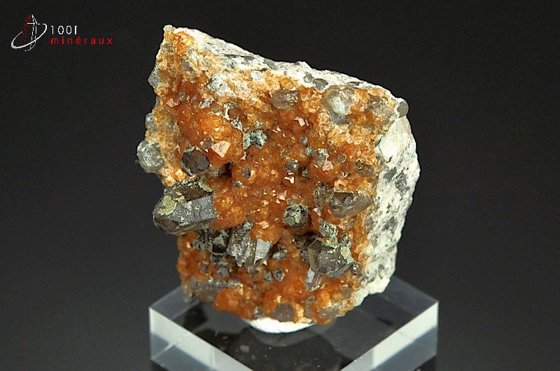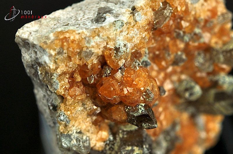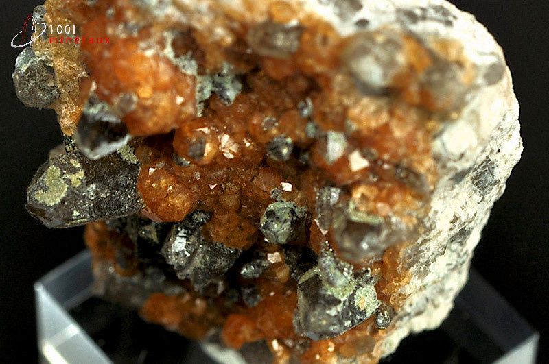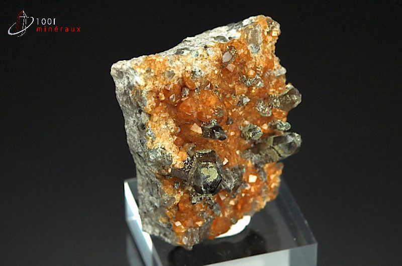 Spécimen de plusieurs cristaux trapezoédiques de Spessartite orange alliés à des cristaux de Quartz fumé.