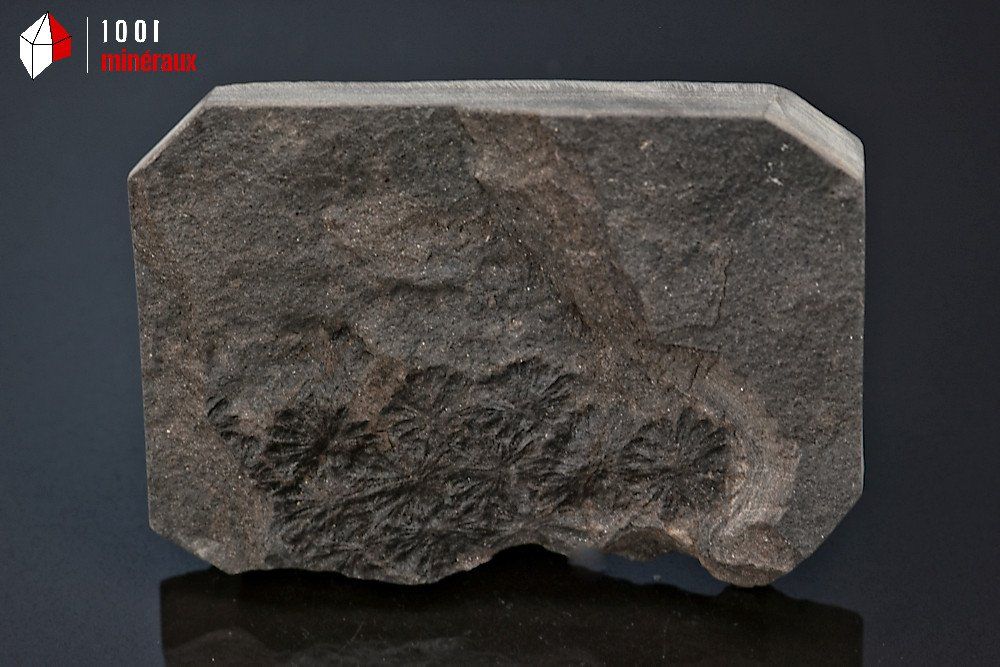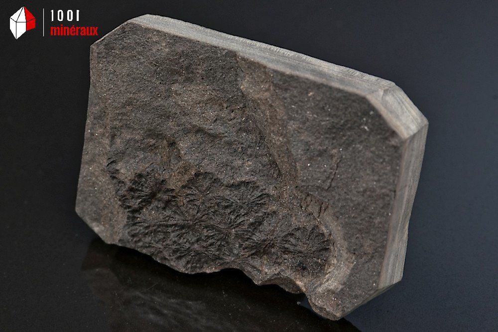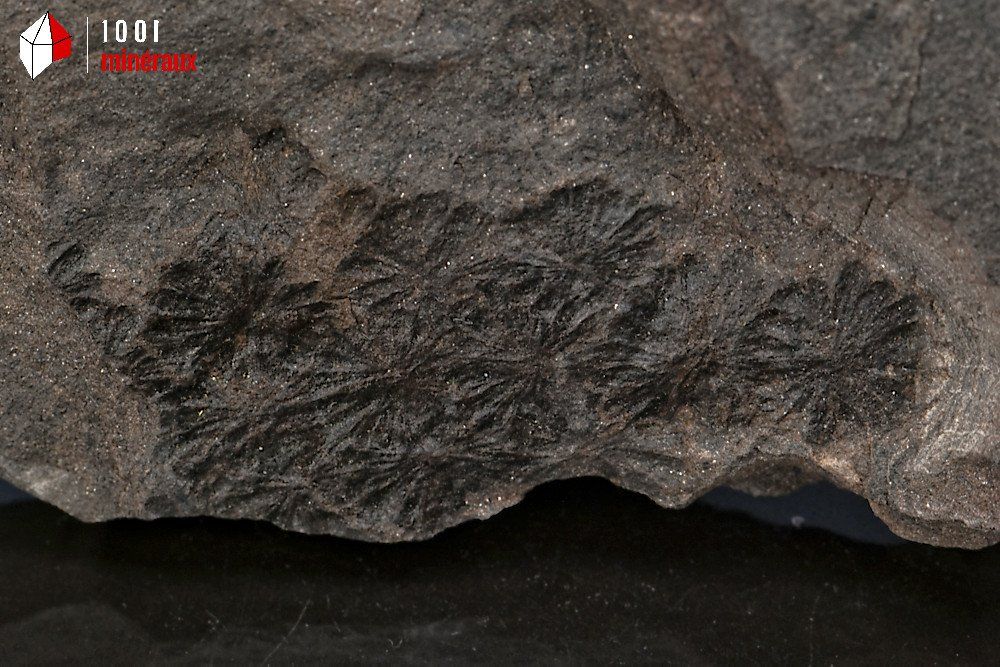 Spécimen sur schiste houiller d'une prêle Sphenophylle (5,2 cm) dont on distingue les feuilles formées de plusieurs verticilles.