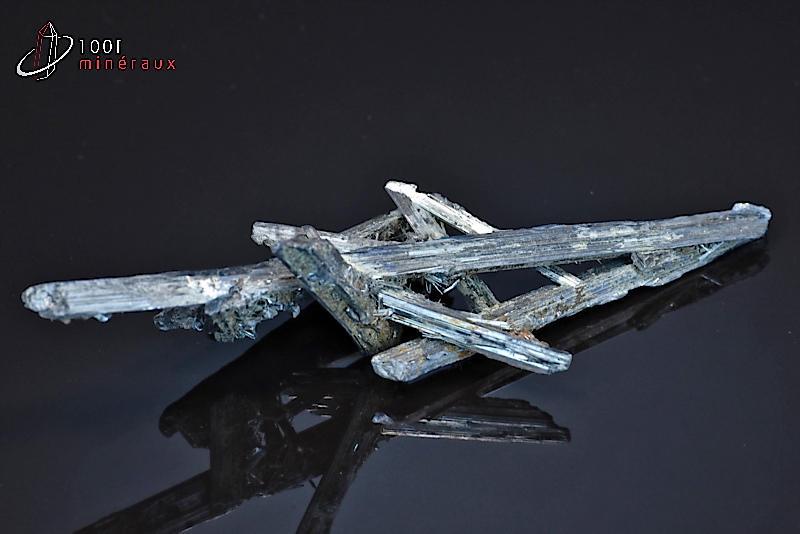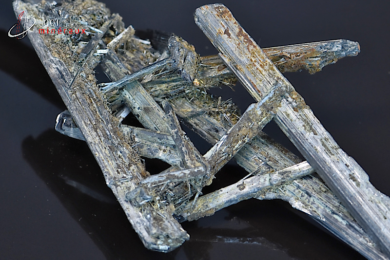La STIBINITE ou STIBINE ou ANTIMONITE appartient au groupe des sulfures. Elle contient de l'antimoine et du soufre. Elle présente généralement une forme massive ou des amas de cristaux aciculaires. Sa couleur est proche du gris foncé avec des reflets metalliques.
