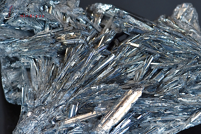 La STIBINITE ou STIBINE ou ANTIMONITE appartient au groupe des sulfures. Elle contient de l'antimoine et du soufre. Elle présente généralement une forme massive ou des amas de cristaux aciculaires. Sa couleur est proche du gris foncé avec des reflets metalliques.