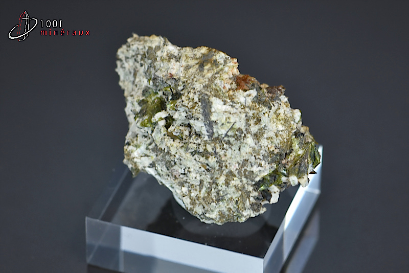 Spécimen présentant quelques cristaux tabulaires verts et bruns translucides de Titanite sur des cristaux d'Orthoclase.