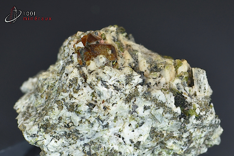 Spécimen présentant quelques cristaux tabulaires bruns translucides de Titanite sur des cristaux d'Orthoclase.