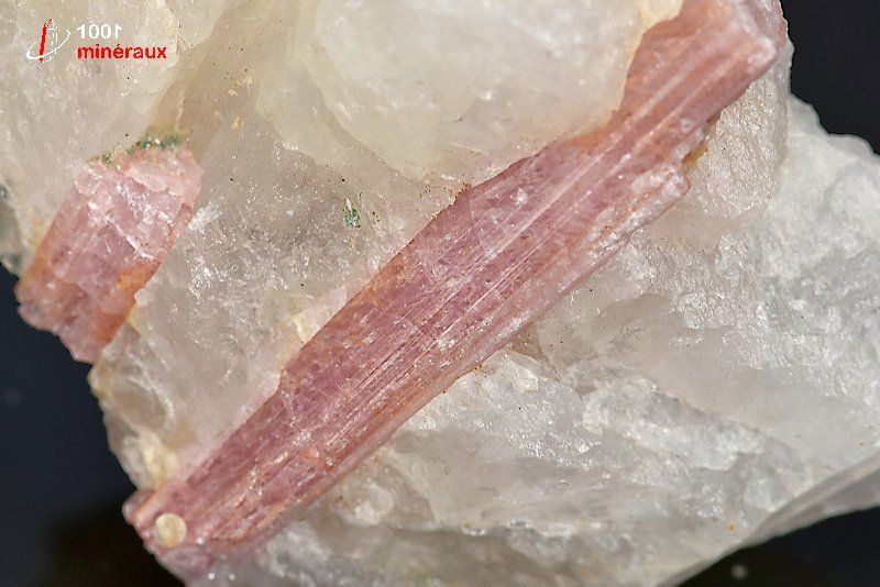 La TOURMALINE appartient au groupe des silicates. Elle contient du sodium, du magnésium, du fer, du lithium, du manganèse, de l'aluminium, du bore, du fluor et du silicium. Elle se présente en cristaux hexagonaux transparents (sauf les noirs) dont les couleurs sont parfois associées (le rouge et le vert dans un magnifique dégradé, par exemple) Les couleur de la TOURMALINE sont multiples : le rose, le vert, le bleu et l'incolore. La Tourmaline rose porte le nom de Rubellite. Ses cristaux sont rares et toujours appréciés des collectionneurs.