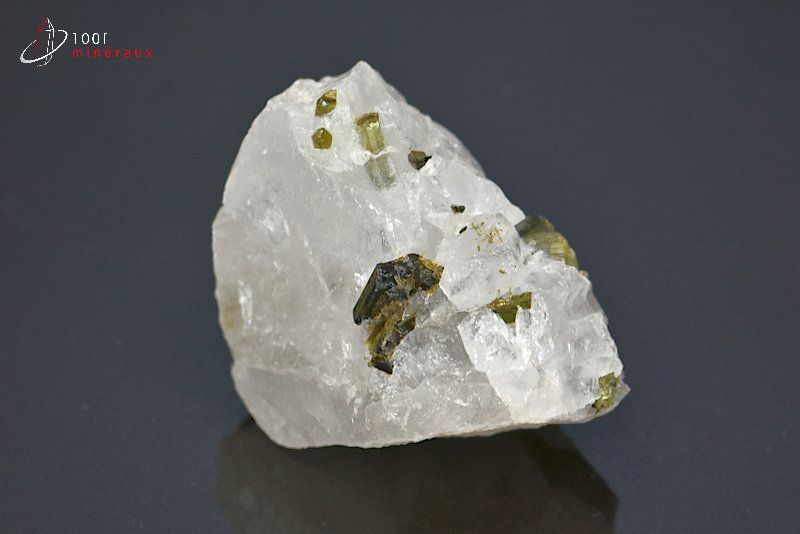 Petits cristaux de Tourmaline verte sur Quartz translucide.