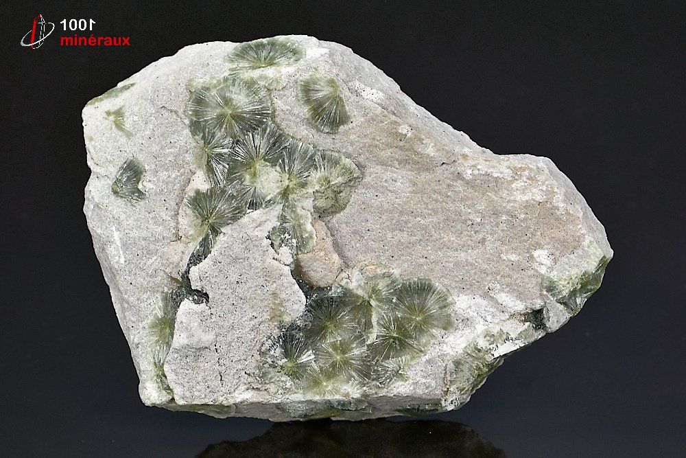 Elle se présente sous forme d'agrégats de cristaux rayonnants de couleur généralement verte ou jaune-vert.