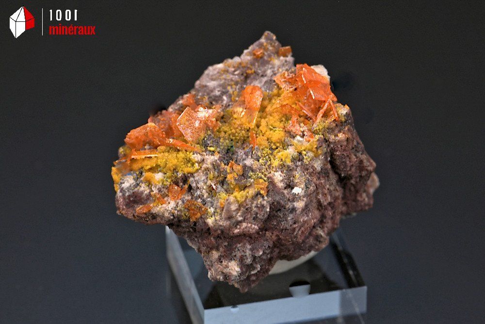 Magnifique spécimen présentant une belle cristallisation tabulaire orange de Wulfénite sur roche.